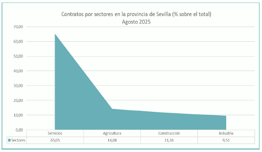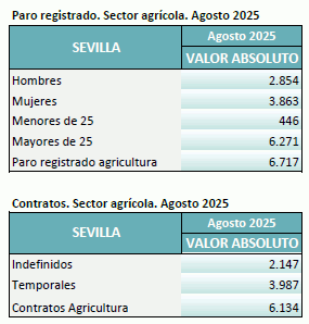 En agosto de 2025, el paro registrado en el sector agrícola en la provincia de Sevilla alcanza un total de 6.717 personas, disminuyendo un 14,21% respecto al mismo mes del año anterior. El total de contratos en el sector agrícola en la provincia de Sevilla ha sido de 6.134 contratos que suponen el 14,08% del total de contratos provinciales