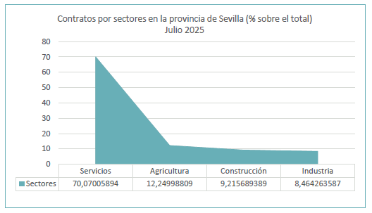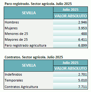 En julio de 2025, el paro registrado en el sector agrícola en la provincia de Sevilla alcanza un total de 6.899 personas, disminuyendo un 14,19% respecto al mismo mes del año anterior. El total de contratos en el sector agrícola en la provincia de Sevilla ha sido de 7.711 contratos que suponen el 12,25% del total de contratos provinciales
