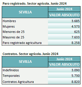 En junio de 2024, el paro registrado en el sector agrícola en la provincia de Sevilla alcanza un total de 8.258 personas, disminuyendo un 15,39% respecto al mismo mes del año anterior. El total de contratos en el sector agrícola en la provincia de Sevilla ha sido de 8.820 contratos que suponen el 14,72% del total de contratos provinciales