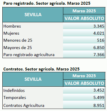 En marzo de 2025, el paro registrado en el sector agrícola en la provincia de Sevilla alcanza un total de 7.366 personas, disminuyendo un 15,50% respecto al mismo mes del año anterior. El total de contratos en el sector agrícola en la provincia de Sevilla ha sido de 8.951 contratos que suponen el 16,56% del total de contratos provinciales