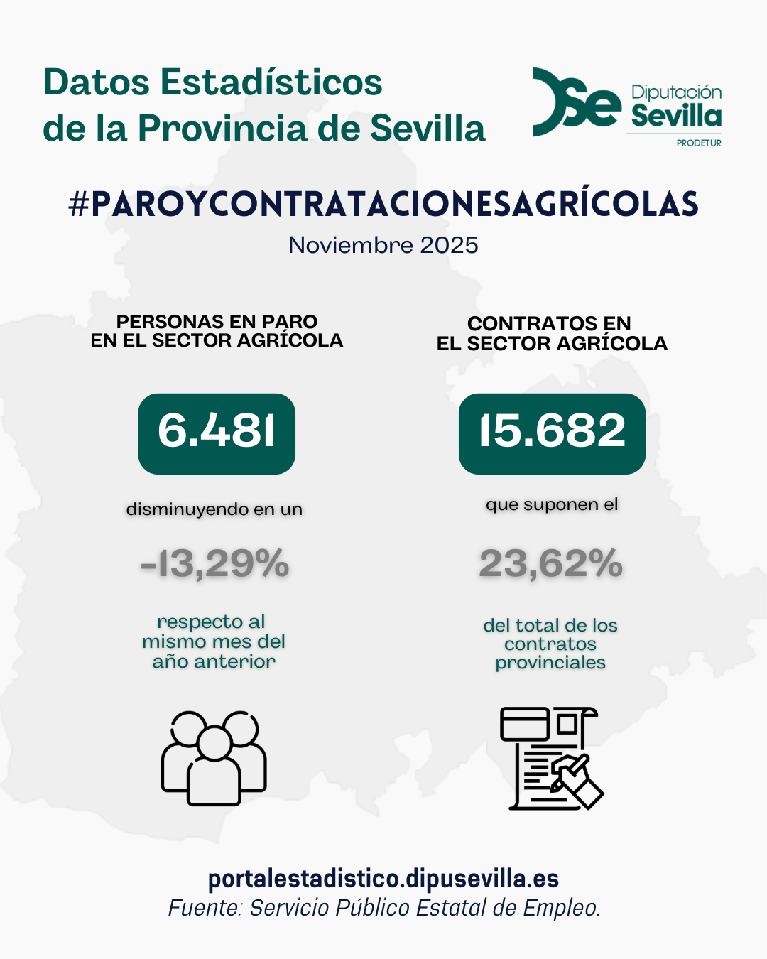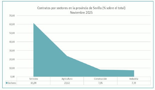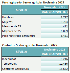 En noviembre de 2025, el paro registrado en el sector agrícola en la provincia de Sevilla alcanza un total de 6.481 personas, disminuyendo un 13,29% respecto al mismo mes del año anterior. El total de contratos en el sector agrícola en la provincia de Sevilla ha sido de 15.682 contratos que suponen el 23,62% del total de contratos provinciales
