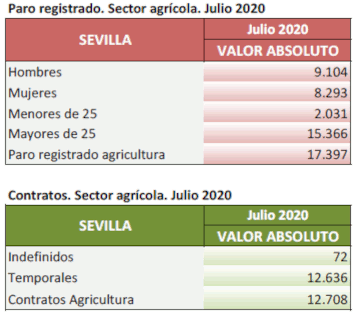 En Julio de 2020, el paro registrado en el sector agrícola en la provincia de Sevilla alcanza un total de 17.397 personas, creciendo el 35,74% respecto al mismo mes del añoanterior. El total de contratos en el sector agrícola en la provincia de Sevilla ha sido de 12.708 contratos que suponen el 18,08% del total de contratos provinciales