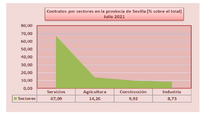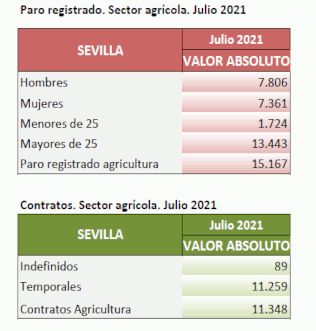 En Julio de 2021, el paro registrado en el sector agrícola en la provincia de Sevilla alcanza un total de 16.197 personas, decreciendo el 3,93% respecto al mismo mes del añoanterior. El total de contratos en el sector agrícola en la provincia de Sevilla ha sido de 15.434 contratos que suponen el 18,55% del total de contratos provinciales