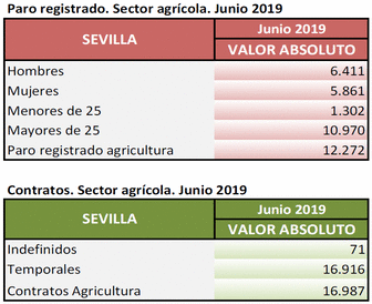 En Junio de 2019, el paro registrado en el sector agrícola en la provincia de Sevilla aumenta el 0,87% respecto al mismo mes del año anterior. Los contratos en el sector agrícola en la provincia de Sevilla suponen el 18,24% del total de contratos provinciales