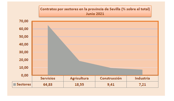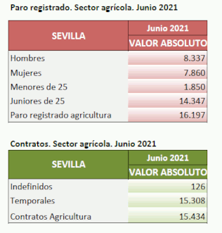 En Junio de 2021, el paro registrado en el sector agrícola en la provincia de Sevilla alcanza un total de 16.197 personas, decreciendo el 3,93% respecto al mismo mes del añoanterior. El total de contratos en el sector agrícola en la provincia de Sevilla ha sido de 15.434 contratos que suponen el 18,55% del total de contratos provinciales