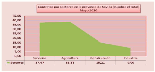 En Mayo de 2020, el paro registrado en el sector agrícola en la provincia de Sevilla alcanza un total de 13.602 personas, creciendo el 21,14% respecto al mismo mes del año anterior. El total de contratos en el sector agrícola en la provincia de Sevilla ha sido de 20.356 contratos que suponen el 38,33% del total de contratos provinciales