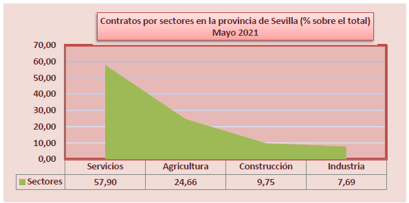 En Mayo de 2021, el paro registrado en el sector agrícola en la provincia de Sevilla alcanza un total de 15.695 personas, creciendo el 15,39% respecto al mismo mes del añoanterior. El total de contratos en el sector agrícola en la provincia de Sevilla ha sido de 19.770 contratos que suponen el 24,66% del total de contratos provinciales