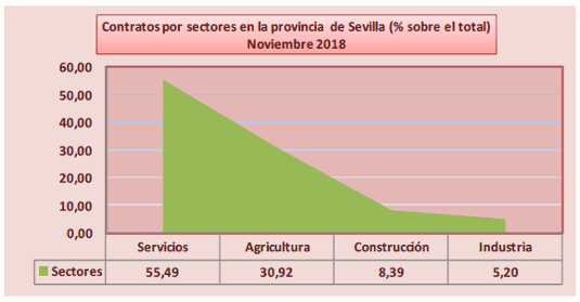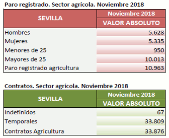 En Noviembre de 2018, el paro registrado en el sector agrícola en la provincia de Sevilla disminuye el 11,39% respecto al mismo mes del año anterior. Los contratos en este sector suponen el 30,92% del total de contratos provinciales y crecen el 6,83% respecto a Noviembre de 2018