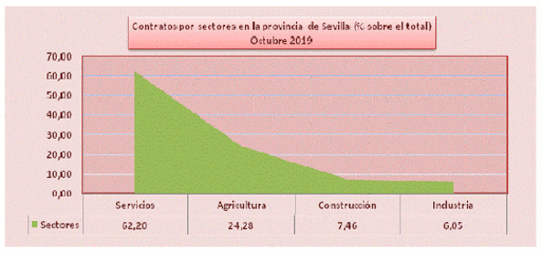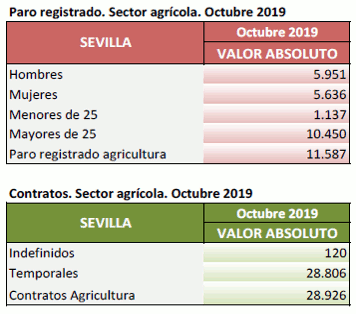En Octubre de 2019, el paro registrado en el sector agrícola en la provincia de Sevilla alcanza las 11.587 personas. El total de contratos en el sector agrícola en la provincia de Sevilla ha sido de 28.926 contratos que suponen el 24,28% del total de contratos provinciales