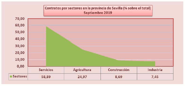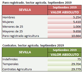 En Septiembre de 2019, el paro registrado en el sector agrícola en la provincia de Sevilla desciende el -9,31% respecto al mismo mes del año anterior. Los contratos en el sector agrícola en la provincia de Sevilla suponen el 24,97% del total de contratos provinciales y crecen el 90,94% respecto a septiembre de 2018