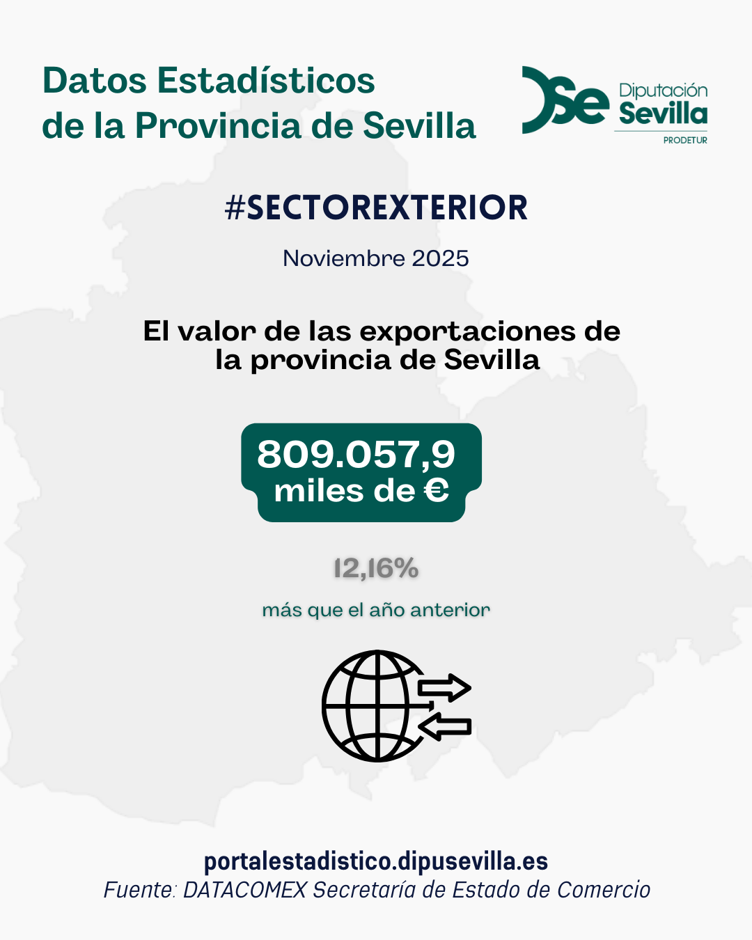 El valor de las exportaciones de la provincia de Sevilla para el mes de noviembre de 2025 ha alcanzado una cifra de 809.057,9 miles de euros, un 12,16% más que el año anterior.