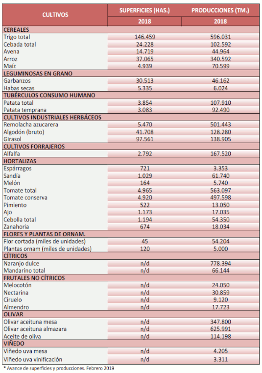 Avance de producciones y superficies agrícolas. Diciembre 2018