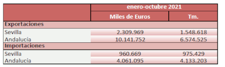 El valor de las exportaciones de productos agroalimentarios de la provincia de Sevilla aumentó el 9,95% en el periodo Enero-Octubre de 2021, respecto al mismo periodo del año anterior
