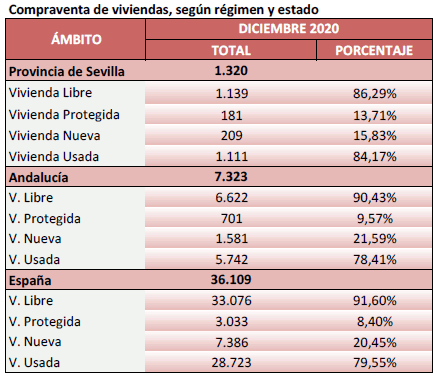 En Diciembre de 2020 se han registrado en la provincia de Sevilla 1.320 contratos de compraventa de viviendas. Un 1,6% menos que el mismo mes del año anterior, y un 3,4% menos que el mes anterior