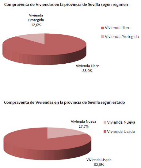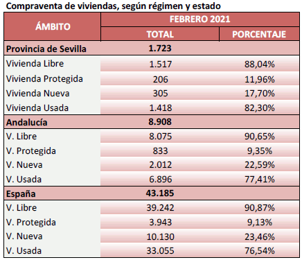 En Febrero de 2021 se han registrado en la provincia de Sevilla 1.723 contratos de compraventa de viviendas. Un 0,2% más que el mismo mes del año anterior, y un 6,3% más que el mes anterior