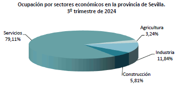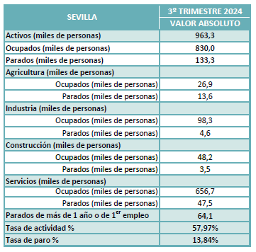 En el tercer trimestre de 2024 sube la ocupación en la provincia de Sevilla en un 4,81% con respecto al mismo periodo del año anterior. Así como, el paro desciende en un -13,50% en términos interanuales. La tasa de paro se sitúa en el 13,84%