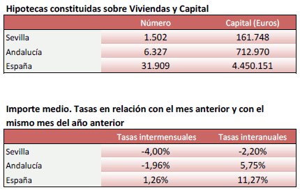 En Abril de 2021, el número de hipotecas sobre viviendas en la provincia de Sevilla es de 1.502, un 2,7% menos que en el mismo mes del año anterior, y un 5,5% más que en el mes anterior