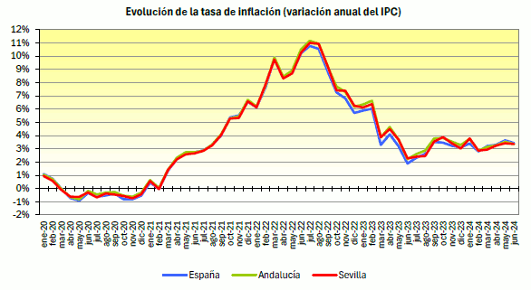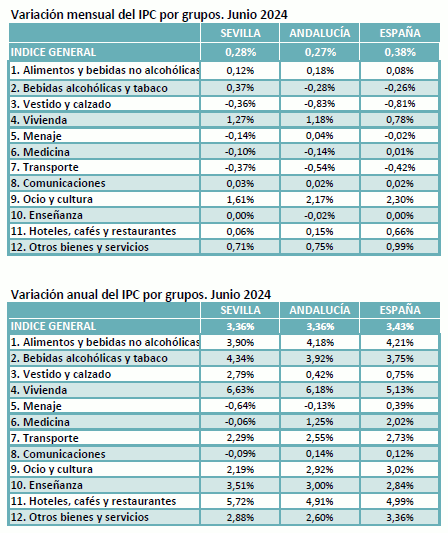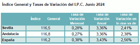 En junio de 2024, el IPC para la provincia de Sevilla decrece un -0,06% respecto al mes anterior, situándose la tasa de variación interanual en el 3,36%