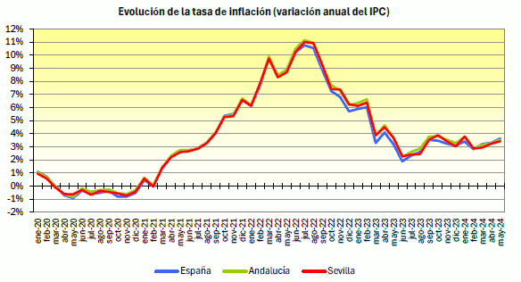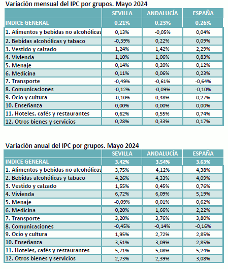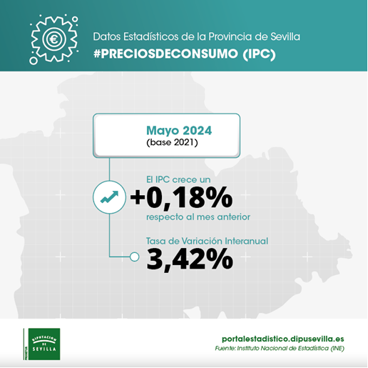 En mayo de 2024, el IPC para la provincia de Sevilla crece un 0,18% respecto al mes anterior, situándose la tasa de variación interanual en el 3,42%
