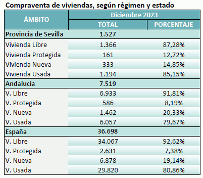 En Diciembre de 2023 se han registrado en la provincia de Sevilla 1.527 contratos de compraventa de viviendas, un 8,1% menos que el mismo mes del año anterior, y un 10,6% menos que el mes anterior