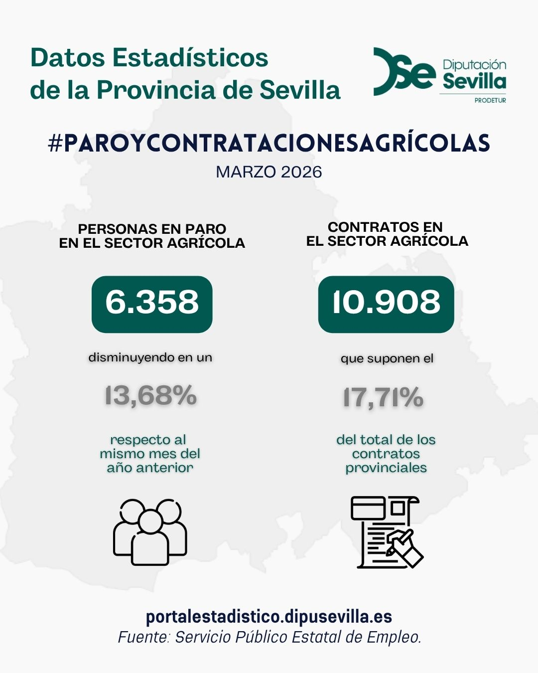 En marzo de 2026, el paro registrado en el sector agrícola en la provincia de Sevilla alcanza un total de 6.358 personas, disminuyendo un 13,68% respecto al mismo mes del año anterior. El total de contratos en el sector agrícola en la provincia de Sevilla ha sido de 10.908 contratos que suponen el 17,71% del total de contratos provinciales