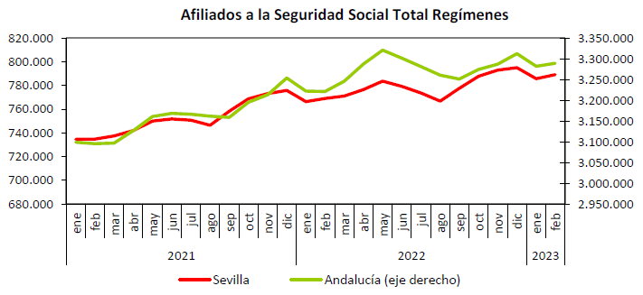 En febrero de 2023 el paro registrado ha descendido en un -6,55% con respecto a febrero del año anterior. Los contratos indefinidos han aumentado en un 118,59% en relación con el mismo mes del año anterior. Las afiliaciones aumentaron en un 2,61% interanual
