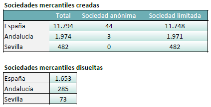 • La creación de sociedades mercantiles en Andalucía disminuye en relación con el año anterior un -7,5%, y crece en España un 0,3%.