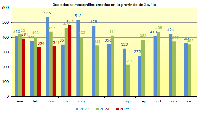• En la provincia de Sevilla se han constituido 482 sociedades mercantiles en abril de 2025, todas sociedades limitadas. El número de sociedades mercantiles creadas en la provincia crece un 4,3% en relación con el año anterior, y un 41,3% más respecto al mes anterior.