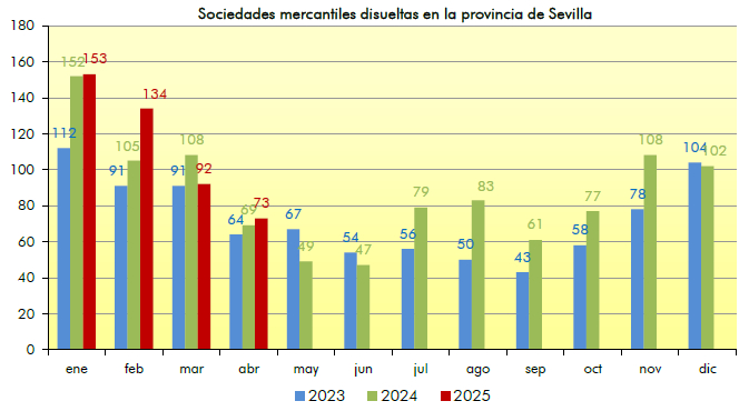 • En abril de 2025 se han disuelto en la provincia de Sevilla 73 sociedades mercantiles, un 5,8% más que en abril de 2024, y un 20,7% menos que respecto al mes anterior.