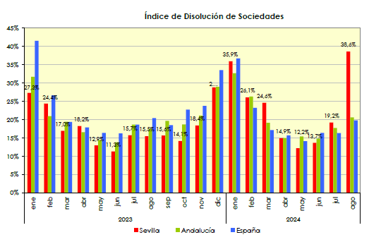 En agosto de 2024 se han creado en la provincia de Sevilla 215 sociedades mercantiles, un -33,4% menos que en el mismo mes del año anterior, y con un descenso del -47,7% respecto al mes anterior