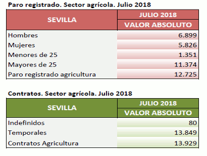 En Julio de 2018, el paro registrado en el sector agrícola en la provincia de Sevilla desciende un 8,18% respecto al mismo mes del año anterior. Los contratos en el sector agrícola en la provincia de Sevilla suponen el 15,2% del total de contratos provinciales