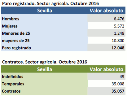 En Octubre de 2016, el paro registrado en el sector agrícola en la provincia de Sevilla ha descendido un 12,82% respecto al mismo mes del año anterior. Los contratos suponen el 32,8% del total de contratos provinciales y crecen un 12,46% respecto al mismo periodo del año 2015