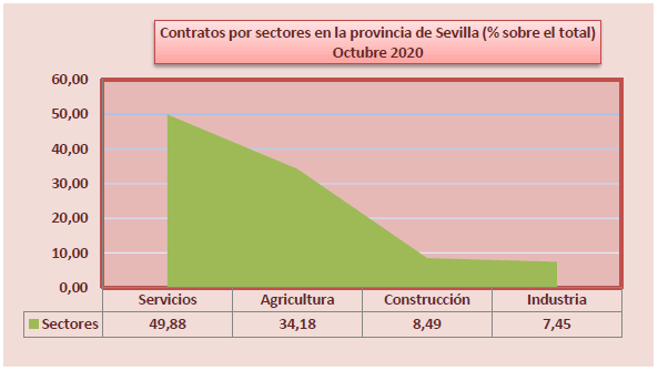 En Octubre de 2020, el paro registrado en el sector agrícola en la provincia de Sevilla alcanza un total de 15.561 personas, creciendo el 34,30% respecto al mismo mes del añoanterior. El total de contratos en el sector agrícola en la provincia de Sevilla ha sido de 30.782 contratos que suponen el 34,18% del total de contratos provinciales
