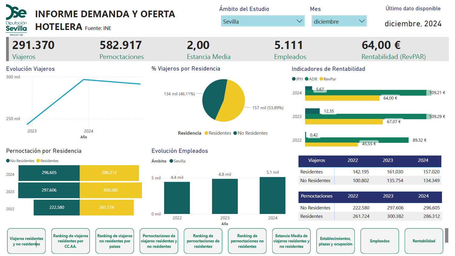 En diciembre de 2024 las pernoctaciones de los viajeros alojados en los hoteles de la provincia de Sevilla alcanzan un total de 582.917 pernoctas