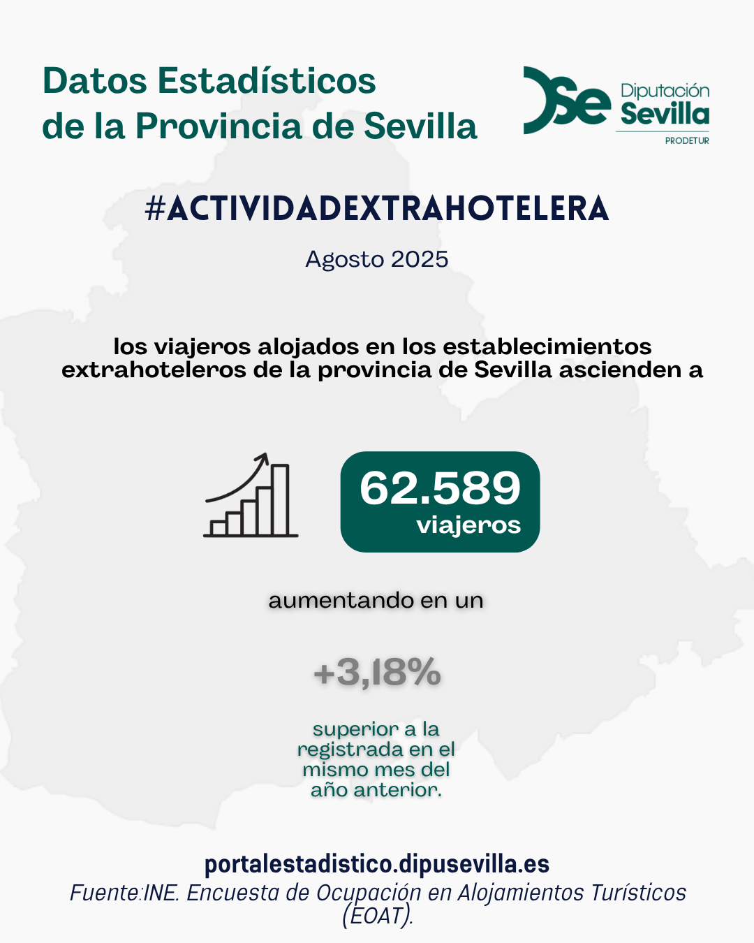 En agosto de 2025, los viajeros alojados en los establecimientos extrahoteleros de la provincia de Sevilla ascienden a 62.589 viajeros, un 3,18% más que el mismo mes del año anterior.