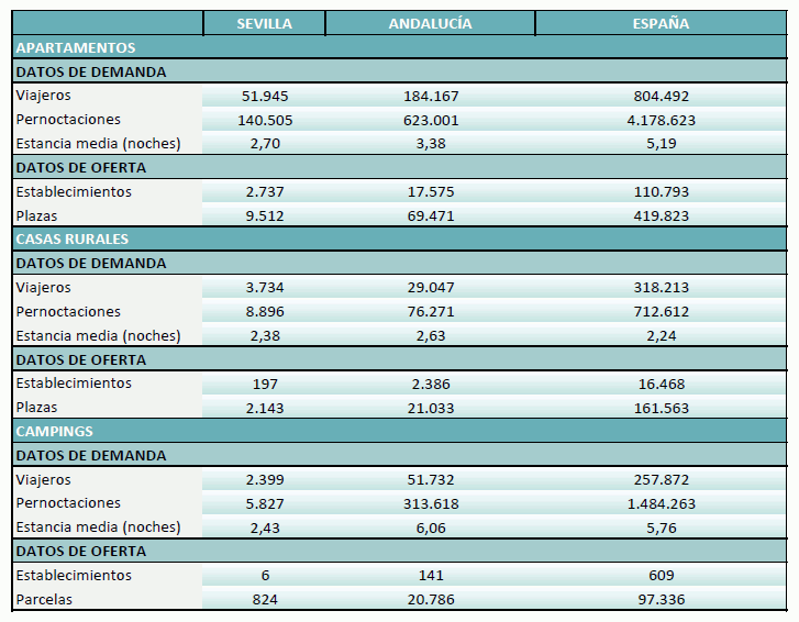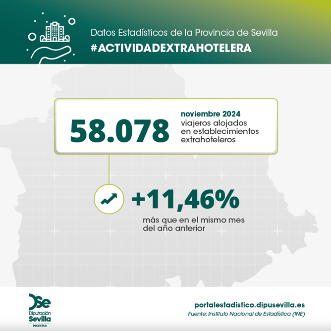 En noviembre de 2024, los viajeros alojados en los establecimientos extrahoteleros de la provincia de Sevilla ascienden a 58.078 viajeros, un 11,46% más que en el mismo mes del año anterior.