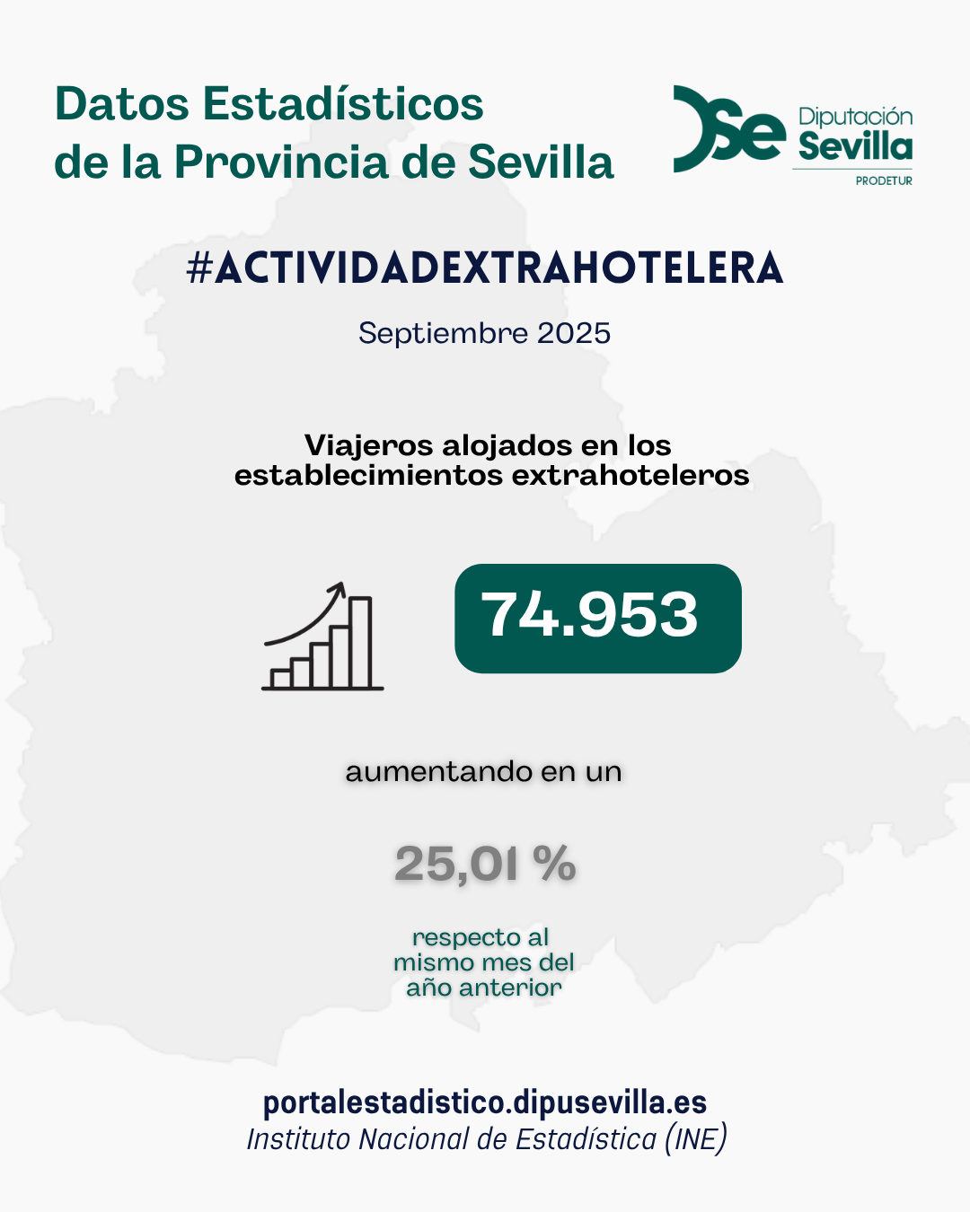 En septiembre de 2025, los viajeros alojados en los establecimientos extrahoteleros de la provincia de Sevilla ascienden a 74.953 viajeros, un 25,01% superior a la registrada en el mismo mes del año anterior.
